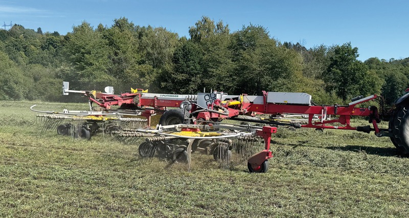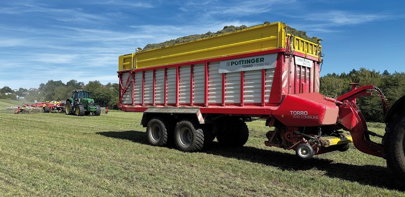 Rychlá a kvalitní sklizeň se senážním vozem TORRO 7010 L COMBILINE. Řádek před ním připravuje čtyřrotorový shrnovač TOP 1252 C s pracovním záběrem až 12,50 metru.