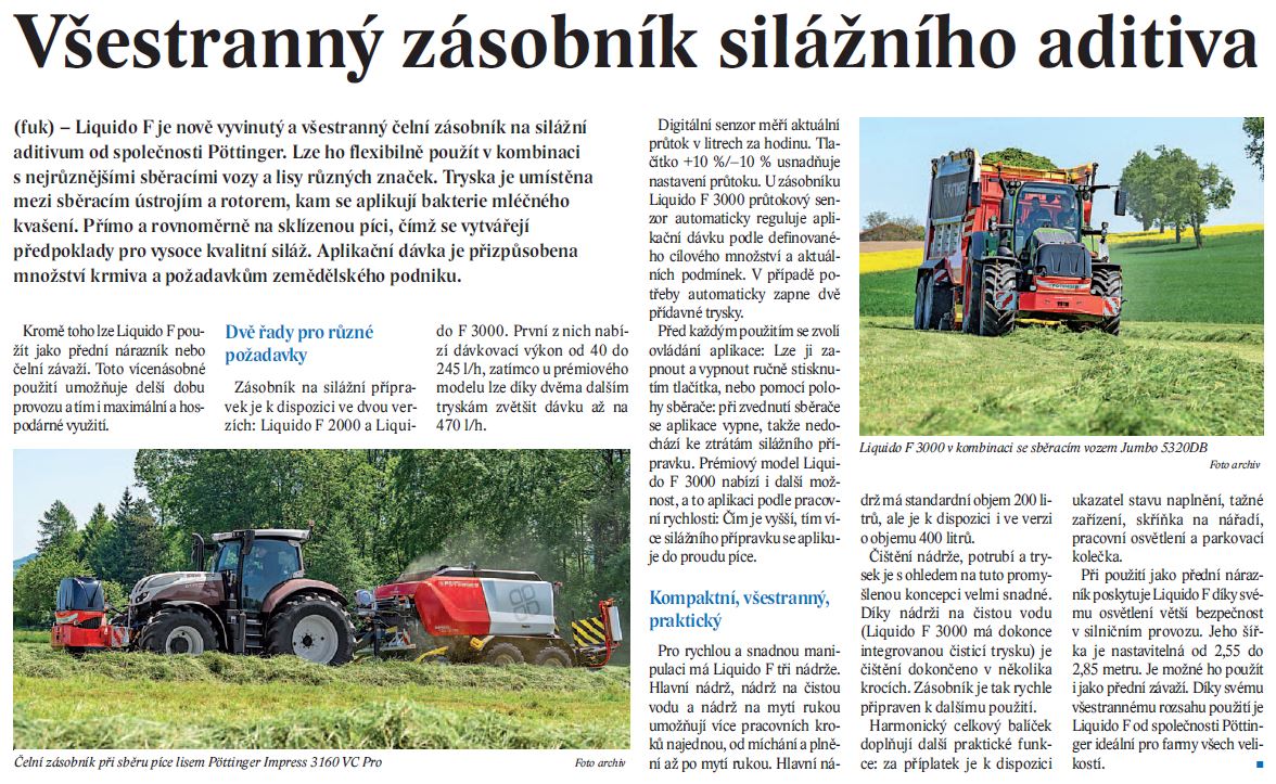LIQUIDO F je nově vyvinutý všestranný aplikátor konzervantů od firmy PÖTTINGER. Nádrž na konzervační prostředky s přesným dávkováním pro homogenní smáčení píce se používá k výrobě vysoce kvalitní senáže. Jako přední nárazník zajišťuje bezpečnost v silničním provozu a jako přední závaží lze LIQUIDO F univerzálně použít v jakékoli zemědělské oblasti. Díky svému komplexnímu a na značce nezávislému použití lze LIQUIDO F používat univerzálně. To zajišťuje maximální ekonomické využití a umožňuje výrobu stabilní senáže.