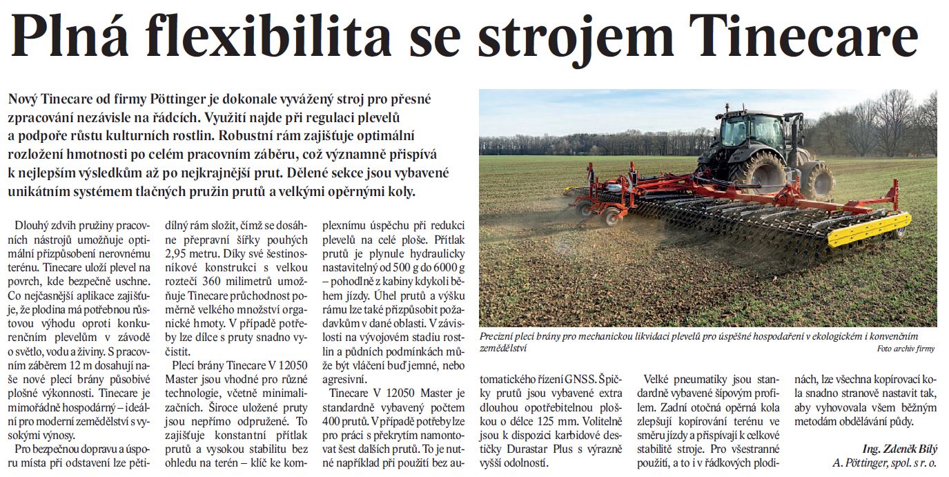 Nový TINECARE od firmy Pöttinger je dokonale vyvážený stroj pro přesné zpracování nezávisle na řádcích. Využití najde při regulaci plevelů a podpoře růstu kulturních rostlin. Robustní rám zajišťuje optimální rozložení hmotnosti po celém pracovním záběru, což významně přispívá k nejlepším výsledkům až po nejkrajnější prut. Dělené sekce jsou vybavené unikátním systémem tlačných pružin prutů a velkými opěrnými koly.