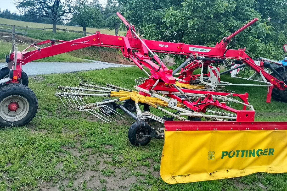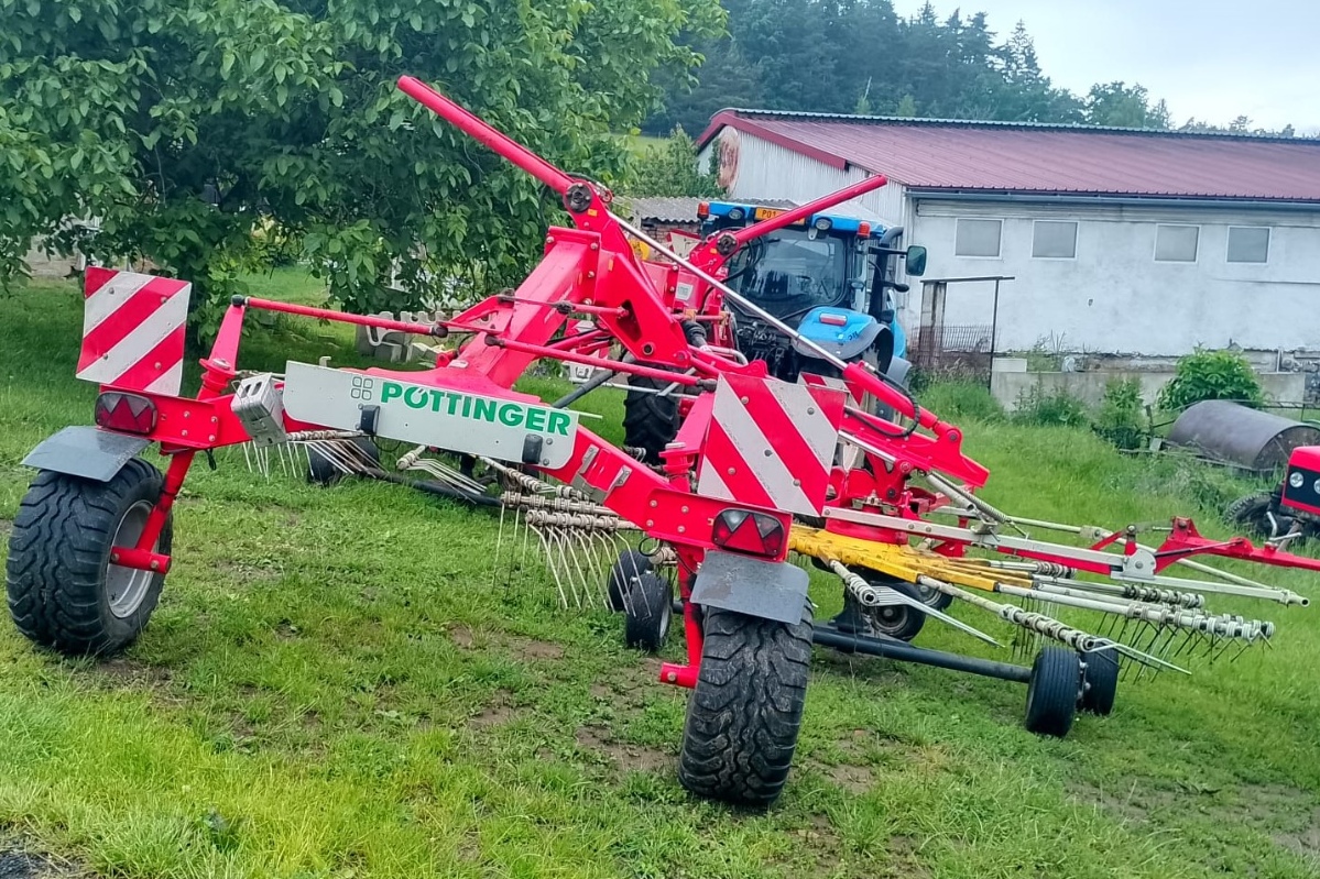 Dvourotorový stranový shrnovač TOP 812, pracovní záběr 7,6 m, čelní kopírovací kolečka a tandemové nápravy rotorů, řízený podvozek, osvětlení, TP