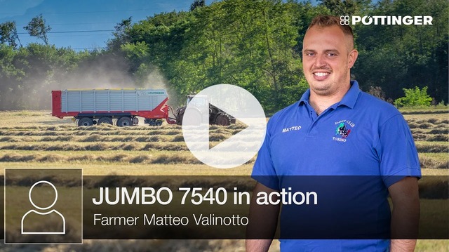 Matteo Valinotto runs a dairy farm in Turin (IT) with around 1300 cattle. He relies on harvesting technology from PÖTTINGER. The farm has been using a JUMBO loader wagon for years to ensure they harvest clean forage. They invested in a Dry Forage Cover to optimise loading capacity.