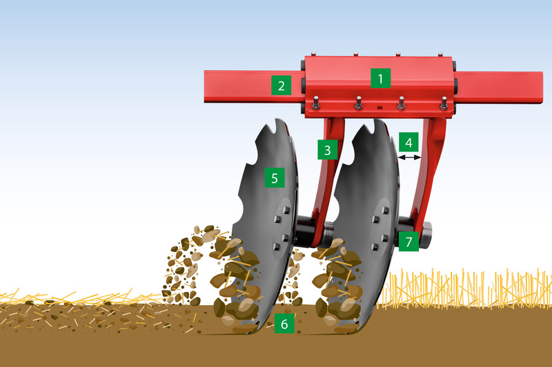 Ein großzügiger Durchgang zwischen Klemmschale, Scheibenträger und Scheibe ermöglicht das verstopfungsfreie Arbeiten auch bei hohen Mengen an organischer Masse und größeren Arbeitstiefen. Dabei öffnet sich der Freiraum zwischen Tragarm und Scheibe in Drehrichtung, um ein Einklemmen von Steinen oder Ernterückständen effektiv zu vermeiden.