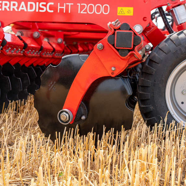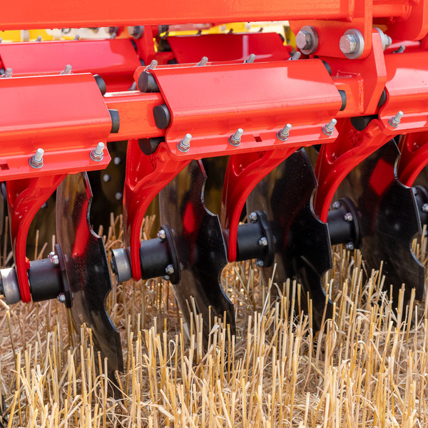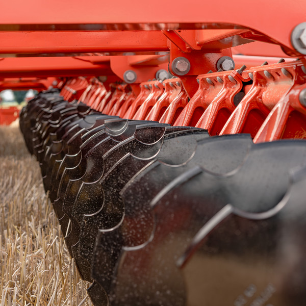 Für höchste Verschleißfestigkeit sind die gezackten oder glatten Hohlscheiben mit einem Durchmesser von 580 mm und einer Dicke von 5 mm aus vergütetem Spezialstahl gefertigt. Die Kombination aus Scheibendurchmesser und aggressiver Scheibenstellung ermöglicht ein ganzflächiges Durchschneiden selbst bei flacher Bearbeitung ab 5 cm. Gleichzeitig wird aber ein zuverlässiges Mischen auch bei tieferem Arbeiten sichergestellt. Die acht Scheiben pro Meter Arbeitsbreite sorgen für den geringen Strichabstand von nur 12,5 cm.