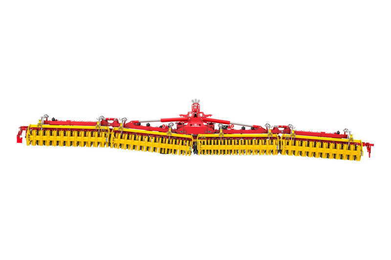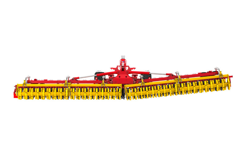 Die gezogenen Scheibeneggen mit 8 m und 10 m Arbeitsbreite sind aus zwei Arbeitsfeldern aufgebaut. Beide Klappfelder können sich so dem Boden anpassen, um eine konstante Arbeitstiefe zu erzielen. Dabei ist ein negativer Durchhang von -3 ° und eine Anpassung nach oben von bis zu 6 ° möglich.