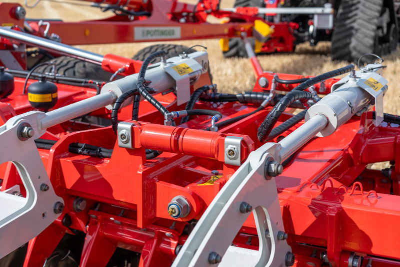 Die Anpassungsfähigkeit der Klappfelder sorgt gemeinsam mit der hydraulischen Vorspannung der Arbeitsfelder für einen konstanten Auflagedruck. Die Vorspannung ist bei der TERRADISC HT 12000 für wechselnde Einsatzbedingungen individuell für die inneren und äußeren Klappfelder jeweils paarweise einstellbar. Das erlaubt mit der Tiefenführung über die Tast- und Fahrwerksräder eine gleichmäßige Bearbeitungstiefe auf voller Arbeitsbreite.
