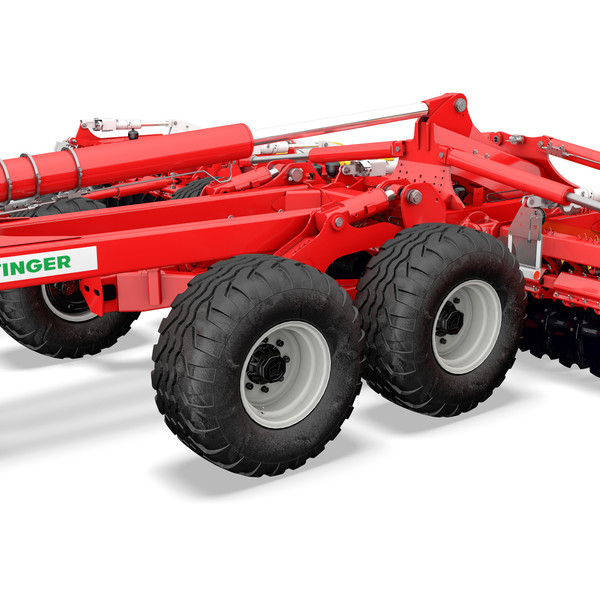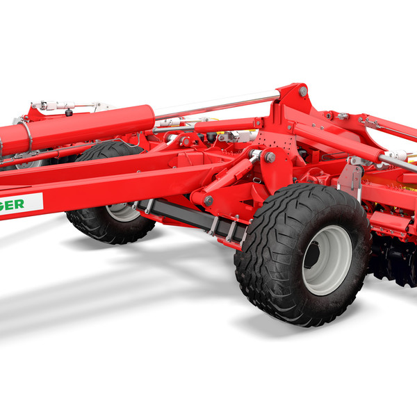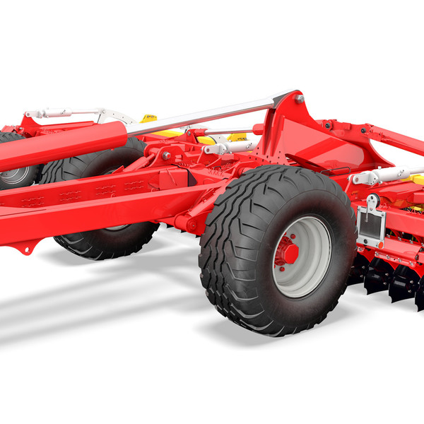 Die TERRADISC 8001 T und TERRADISC 10001 T Scheibeneggen sind serienmäßig mit einer Einzelachse mit 3 m Außenbreite ausgestattet. Diese ist als ungebremste Variante oder als gebremste Achse mit Druckluftbremsanlage oder hydraulischer Bremse erhältlich. Zudem steht wahlweise eine 3,5 m breite und ungebremste Einzelachse bereit. Die Bereifung ist jeweils in der Dimension 560/45 R22,5 ausgeführt.
