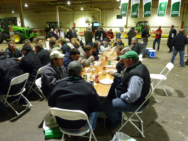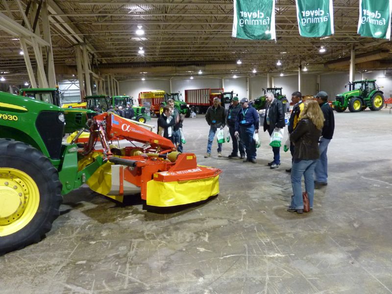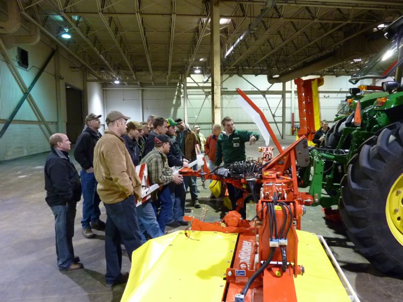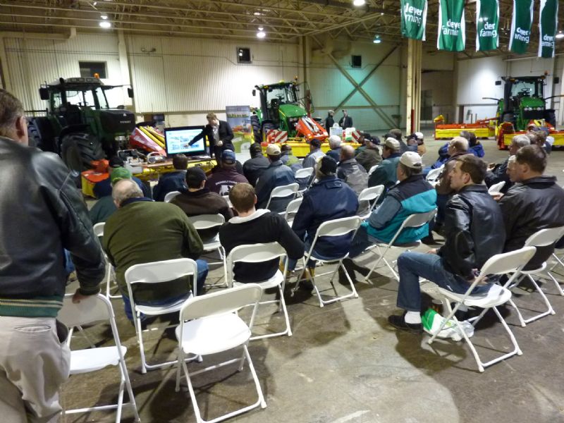 „Wir befinden uns in St. Marys, einem 6.500 Seelen zählenden Ort in Südwest-Ontario in Mitten eines der fruchtbarsten landwirtschaftlichen Gebiete Kanadas. In einer Produktionshalle präsentieren sich in einem großen Kreis 20 Pöttinger Maschinen, eingeteilt in die Gruppen Mähwerke, Zetter & Schwader, Ladewagen und Bodenbearbeitung, größtenteils angebaut an John Deere und Fendt Traktoren. Ziel der Veranstaltung ist es, Verkäufer und Servicetechniker unserer Händler ausführlich an den Pöttinger-Maschinen zu schulen und weiterzubilden. Zudem erhalten potenzielle Kunden die Gelegenheit, die gesamte Produktpalette beim Tag der offenen Tür kennen zu lernen und zu erleben.