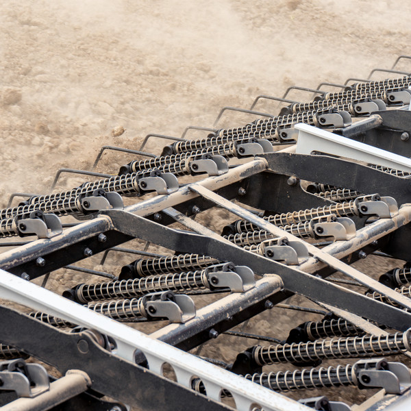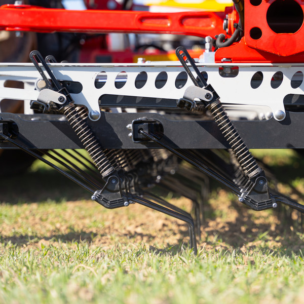 The tine sections on the TINECARE V feature a simple, light and crop-friendly design. The indirect pressure application system on the precision tine harrow is equipped with a spiral compression spring. Because the spring is located above the tine, it prevents even taller crop plants from being damaged by moving parts.